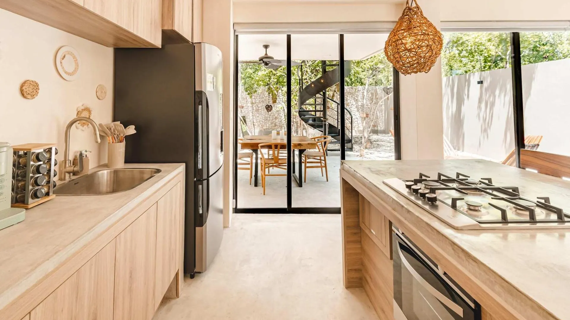 Selva Pixan Tulum Villa With Rooftop Pool offers an equipped kitchen with all necessary appliances, like a fridge, a kitchenware, and glassware.